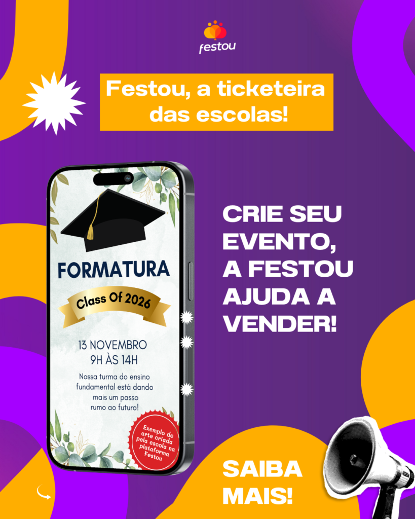 A Festou permite que a escola realize a venda online antecipada de ingressos, reduzindo filas e evitando concentração de público na bilheteria. Cada ingresso é gerado com QR Code individual, permitindo validação rápida na entrada por meio de leitores digitais.